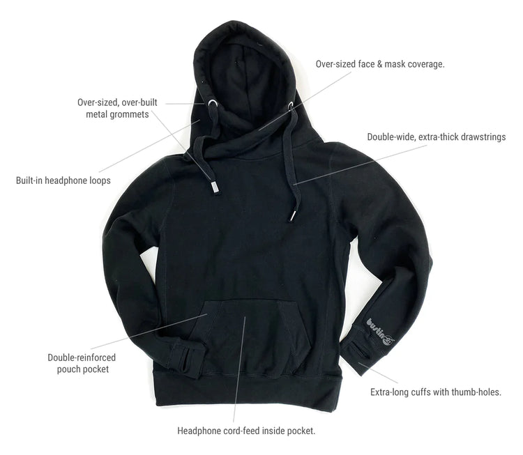 An over-sized, incognito hoodie to help you push through strange times. Extended cuffs with thumbholes and an over-sized face design help keep you under wraps. Over-built with heavy duty materials to withstand a true skate-everything lifestyle and designed with a flat-black minimalist design profile.